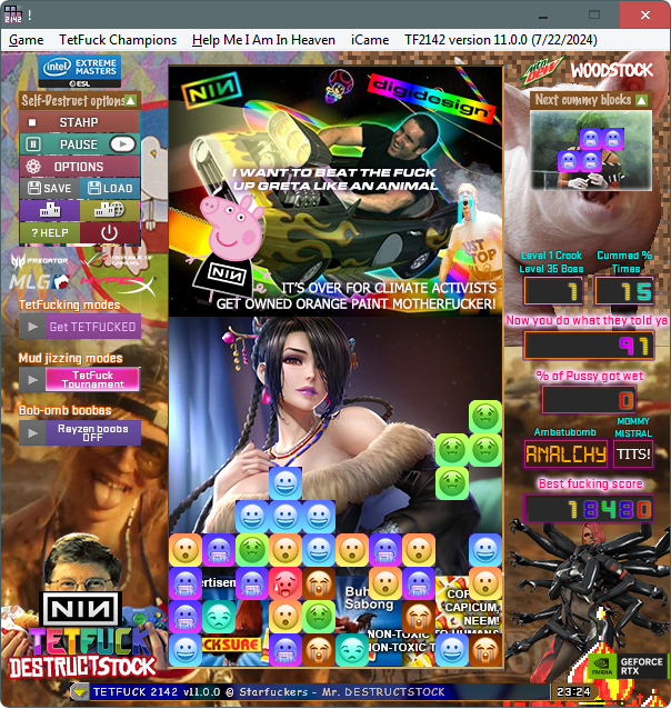 Alright, you sick sons of bitches, gather ’round! Remember when your pathetic eyes witnessed the raw, pulsating glory of TetFuck: Peel My Foreskin Back? That’s right, the game that made you question every life choice leading up to that moment, the Tetris parody so fucked up it caused a global shortage of therapist appointments. Well, buckle up, buttercups, because we’re about to shove another load of digital depravity straight into your retinas! We’re dropping a massive, throbbing update, and it’s named after Nine Inch Nails 2025 tour, “Peel It Back.” Because if there’s one thing we love more than making you uncomfortable, it’s intellectual property infringement and a good old-fashioned foreskin joke. But wait, there’s more! Not only are we shamelessly ripping off Trent Reznor’s marketing genius, but this update also features a bootleg live version of the “Peel It Back” concert as TetFuck soundtrack. That’s right, you get to experience the raw, unadulterated “live” experience, complete with pixelated stage dives, questionable audio quality, and the nagging feeling that you’re watching something you shouldn’t be. It’s like being at the real concert, but with less body odor and more block-dropping mayhem. Now, let’s talk about the elephant in the room, the graphical upgrade that will make your eyeballs ejaculate with pure, unadulterated bliss. You know all those fancy-pants triple-A games running on Unreal Engine 5? The ones with their realistic puddles and their hyper-detailed character models? Yeah, well, they can all go fuck themselves. Because the new TetFuck: Peel My Foreskin Back update is about to drop a graphical bomb that will make every single one of those so-called “next-gen” titles look like a blurry ass TAA JPEG. We’re talking about a leap in visual fidelity so profound, so groundbreaking, so utterly mind-blowing, that your GPU will spontaneously combust in a glorious explosion of pure, unadulterated graphical power. Forget ray tracing, forget lumen, forget all that bullshit. We’ve invented a new rendering technique we’re calling “Retinal Rape,” and it’s going to melt your brain instantly. Let’s go back to music, aside from Nine Inch Nails, again, we gonna add more music including the Megaupload Song, Dave Blunts and Kanye West songs, Rage Against The Machine, System Of A Down, Cock and Ball Tourture, Metallica songs, Heir To The Cum Throne, Limp Bizkit’s Break Stuff, and much much more. TetFuck: Peel My Foreskin Back includes TetFuck 2142, TetFuck 4K, and TetFuck Five, all with new content. And for the first time, we will also release Pussyo Pussyo: Cunny Crysis, which is based on Puyo Puyo puzzle game. The TetFuck Box - Out Now!Aug 15, 2024The new TetFuck: Mr. DestructStock update is out now for TetFuck 2142! Additionally, we also released The TetFuck Box, a collection of TetFuck and Pussyo Pussyo games. Also happy Woodstock '94 30th anniversary once again.